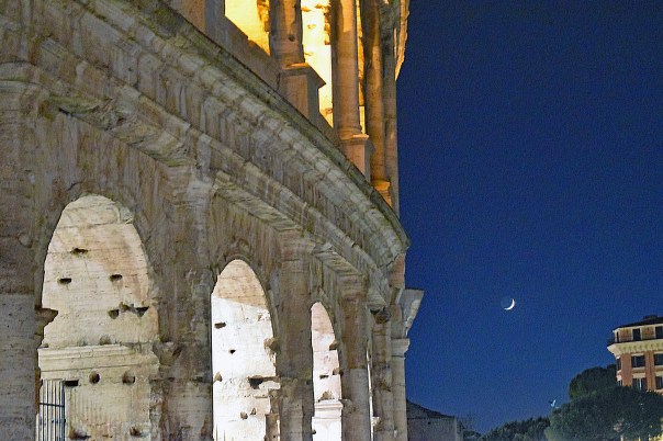 Any reasonable person would decide that after 19 hours of travel, one would rest and start anew the next day. We did rest, but only for a few hours, and then three of our party of four walked down to the Coliseum (or Colosseum) at sunset for a night tour of the ancient Roman icon.