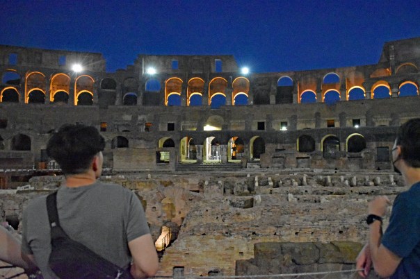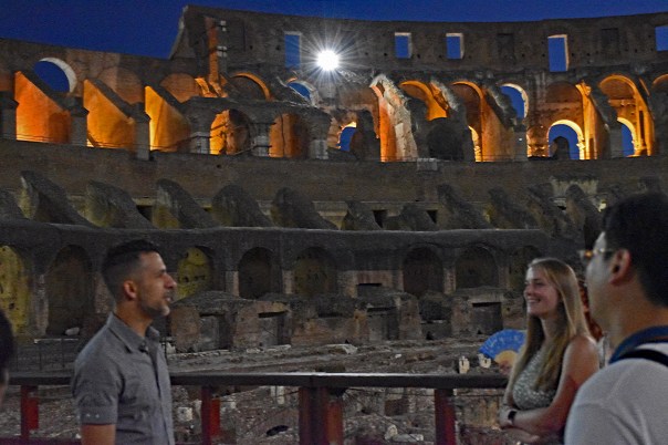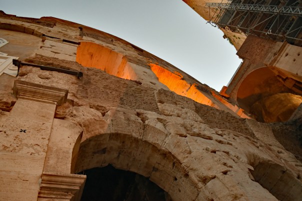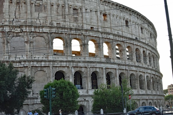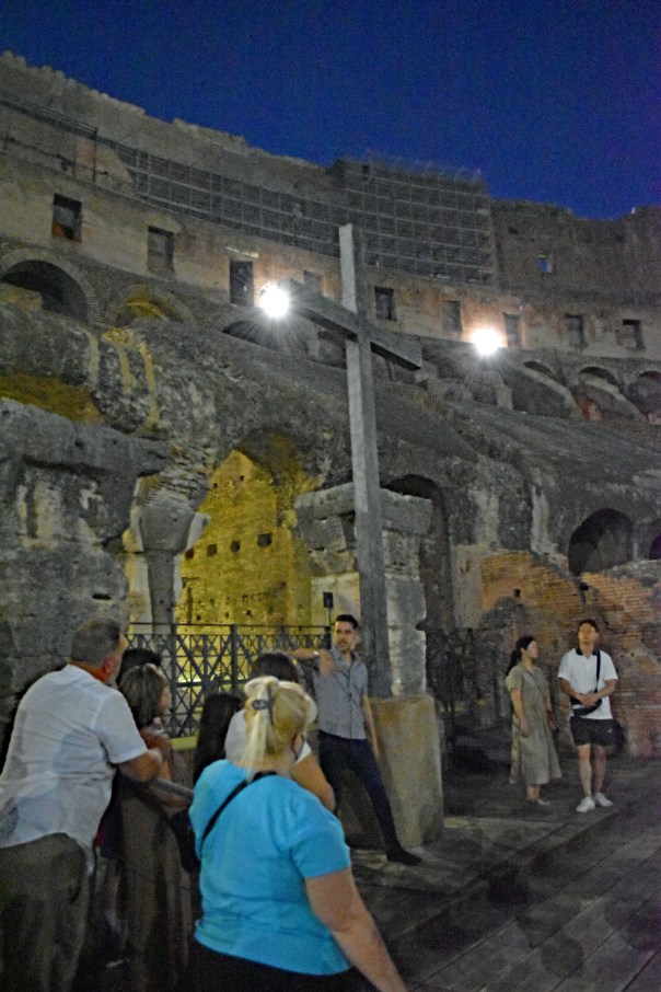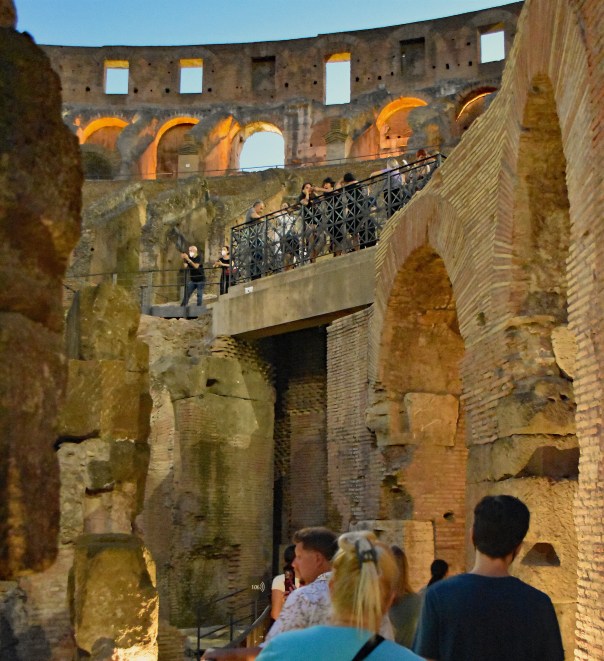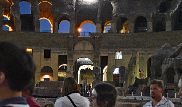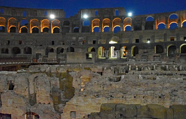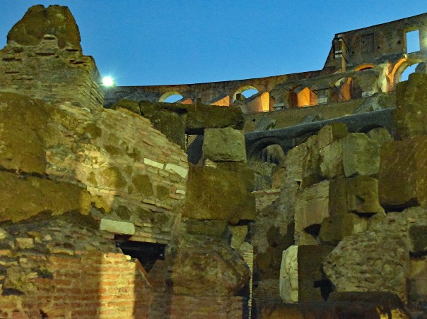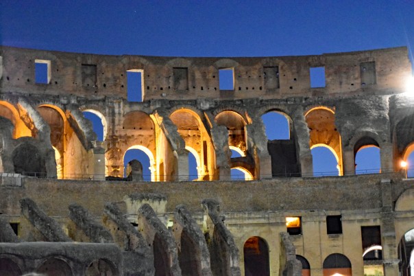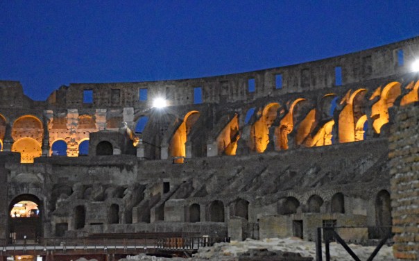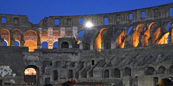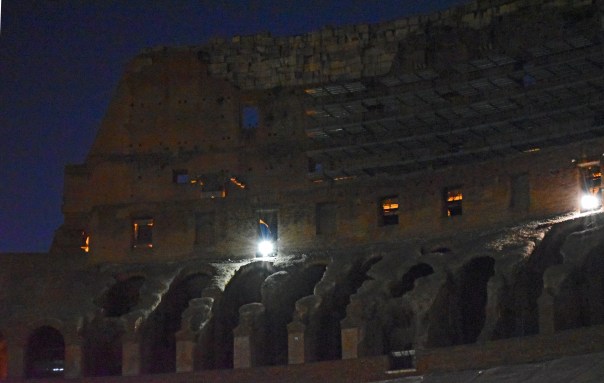 Any reasonable person would decide that after 19 hours of travel, one would rest and start anew the next day. We did rest, but only for a few hours, and then three of our party of four walked down to the Coliseum (or Colosseum) at sunset for a night tour of the ancient Roman icon.