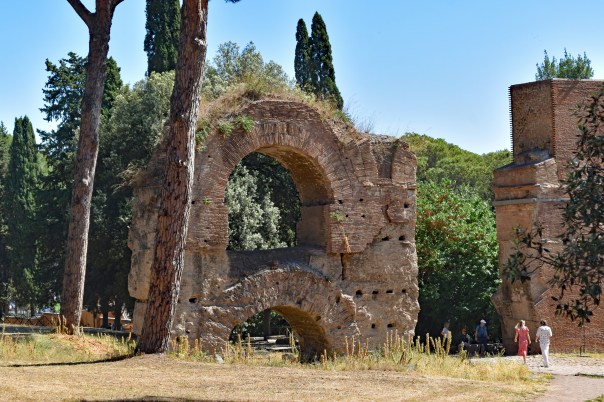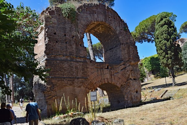 When climbing up the east side of Palatine Hill, the first significant structure is the remains of the Claudia Aqueduct. This aqueduct was 69 kilometers (43 miles) long. The final sections of the aqueduct were transported on a brick structure that at some locations was over 30 meters (100 ft.) tall. It delivered up to 190,000 cubic meters (6.7 million cubic feet) of water in a 24-hour period.