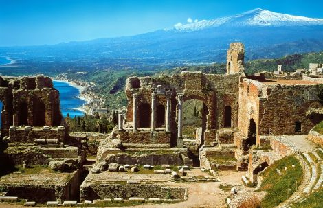 - Reach the Arab-influenced Corvaja Palace, a magnificent structure dating to the 15th century. Continue to the spectacular Greek Theatre, beautifully situated with panoramic views of the sea, the countryside and the conical summit of Mt. Etna. Originally built in the third century BC and reconstructed in a Roman style in the second century, this spectacular theatre is the second largest in Sicily, after the one in Syracuse. Today, the acoustics at the theatre are still extraordinary.